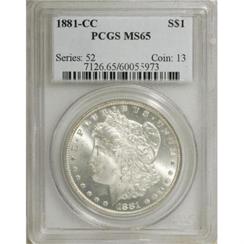 <B>1881-CC $1 MS65 PCGS.</B></I> Highly lustrous silver surfaces with full mint frost are the most important attributes of this Gem Morgan dollar.<BR><BR><B>Coin Engraver:</B> George T. Morgan<BR><BR><b>Shipping:</b> Coins & Currency (<a target="_blank" href="http://www.heritageauctions.com/common/shipping.php">view shipping information</a>)