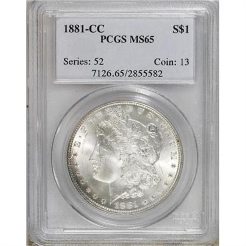 <B>1881-CC $1 MS65 PCGS.</B></I> . PCGS Population (3787/1515). NGC Census: (1681/706). Mintage: 296,000. Numismedia Wsl. Price for NGC/PCGS coin in MS65: $735. (#7126)<BR><BR><B>Coin Engraver:</B> George T. Morgan<BR><BR><b>Shipping:</b> Coins & Currency (<a target="_blank" href="http://www.heritageauctions.com/common/shipping.php">view shipping information</a>)