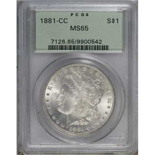 <B>1881-CC $1 MS65 PCGS.</B></I> PCGS Population (3800/1523). NGC Census: (1685/707). Mintage: 296,000. Numismedia Wsl. Price for NGC/PCGS coin in MS65: $735. (#7126)<BR><BR><B>Coin Engraver:</B> George T. Morgan<BR><BR><b>Shipping:</b> Coins & Currency (<a target="_blank" href="http://www.heritageauctions.com/common/shipping.php">view shipping information</a>)