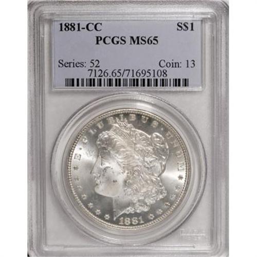 <B>1881-CC $1 MS65 PCGS.</B></I> A frosty and lustrous Gem with brilliant surfaces and exceptional eye appeal. Boldly struck and immensely desirable, a grand example of this low-mintage Carson City issue.<BR><BR><B>Coin Engraver:</B> George T. Morgan<BR><BR><b>Shipping:</b> Coins & Currency (<a target="_blank" href="http://www.heritageauctions.com/common/shipping.php">view shipping information</a>)