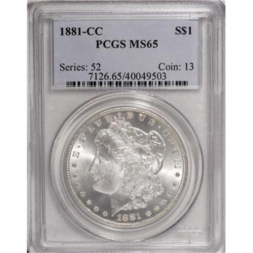 <B>1881-CC $1 MS65 PCGS.</B></I> Vibrant silver-white with incredibly frosty, fully lustrous surfaces that are well struck and nicely preserved. A few minor luster grazes on Liberty's cheek and the eagle's breast are entirely consistent with the Gem designation.<BR><I>From The Oxford Collection.</B></I><BR><BR><B>Coin Engraver:</B> George T. Morgan<BR><BR><b>Shipping:</b> Coins & Currency (<a target="_blank" href="http://www.heritageauctions.com/common/shipping.php">view shipping information</a>)