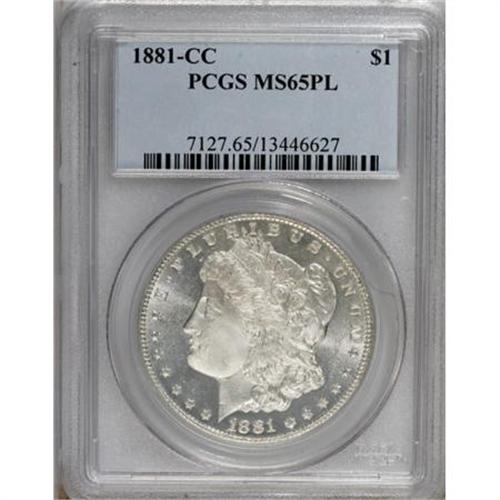 <B>1881-CC $1 MS65 Prooflike PCGS.</B></I> VAM-2. Die fill within the upper loop of the second 8 in the date somewhat resembles the "8 Over Low 7" 1880-CC variety. The prominently mirrored fields are brilliant, and the centers are penetratingly struck.<BR><BR><B>Coin Engraver:</B> George T. Morgan<BR><BR><b>Shipping:</b> Coins & Currency (<a target="_blank" href="http://www.heritageauctions.com/common/shipping.php">view shipping information</a>)