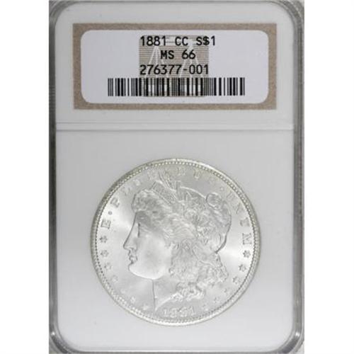 <B>1881-CC $1 MS66 NGC.</B></I> VAM-2, identified by die fill within the second 8 in the date. This lightly toned and thoroughly lustrous Premium Gem has impressive preservation and outstanding eye appeal.<BR><BR><B>Coin Engraver:</B> George T. Morgan<BR><BR><b>Shipping:</b> Coins & Currency (<a target="_blank" href="http://www.heritageauctions.com/common/shipping.php">view shipping information</a>)