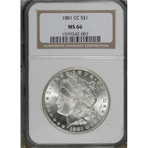 <B>1881-CC $1 MS66 NGC.</B></I> This beautiful Premium Gem is snow-white, with a thick layer of shimmering mint frost over each side. The design elements were produced with razor-sharp precision at the fabled Carson City Mint. Carefully preserved and distraction-free. <BR><BR><B>Coin Engraver:</B> George T. Morgan<BR><BR><b>Shipping:</b> Coins & Currency (<a target="_blank" href="http://www.heritageauctions.com/common/shipping.php">view shipping information</a>)