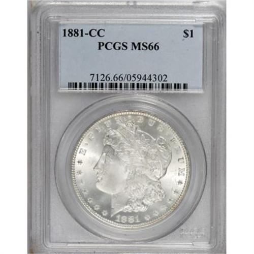 <B>1881-CC $1 MS66 PCGS.</B></I> Radiantly lustrous surfaces display sharply struck design elements and are quite well preserved, save for a few trivial, grade-consistent marks. Both sides possess a pleasing silvery color.<BR><BR><B>Coin Engraver:</B> George T. Morgan<BR><BR><b>Shipping:</b> Coins & Currency (<a target="_blank" href="http://www.heritageauctions.com/common/shipping.php">view shipping information</a>)