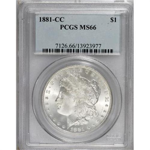 <B>1881-CC $1 MS66 PCGS.</B></I> An untoned example, with highly lustrous surfaces that exhibit sharply struck design elements. Each side is well preserved.<BR><BR><B>Coin Engraver:</B> George T. Morgan<BR><BR><b>Shipping:</b> Coins & Currency (<a target="_blank" href="http://www.heritageauctions.com/common/shipping.php">view shipping information</a>)
