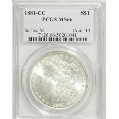 <B>1881-CC $1 MS66 PCGS.</B></I> A lustrous and sharply struck Premium Gem, essentially untoned with some mellowed silver-gray on the reverse. Great eye appeal with clean devices, a delightful Carson City dollar.<BR><BR><B>Coin Engraver:</B> George T. Morgan<BR><BR><b>Shipping:</b> Coins & Currency (<a target="_blank" href="http://www.heritageauctions.com/common/shipping.php">view shipping information</a>)