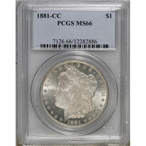<B>1881-CC $1 MS66 PCGS.</B></I> An outstanding representative of this popular low-mintage Carson City issue, decisively struck with rich mint frost on the rose-inflected central devices. Slight haziness appears over fields with powerful cartwheel luster.<BR><BR><B>Coin Engraver:</B> George T. Morgan<BR><BR><b>Shipping:</b> Coins & Currency (<a target="_blank" href="http://www.heritageauctions.com/common/shipping.php">view shipping information</a>)