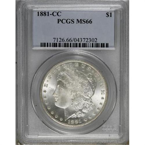 <B>1881-CC $1 MS66 PCGS.</B></I> Fully struck and untoned, with intense mint frost that produces an effulgent sheen across both sides. Exquisitely preserved with a couple of highly superficial luster grazes on the obverse that prevent an even loftier grade assessment. <BR><BR><B>Coin Engraver:</B> George T. Morgan<BR><BR><b>Shipping:</b> Coins & Currency (<a target="_blank" href="http://www.heritageauctions.com/common/shipping.php">view shipping information</a>)