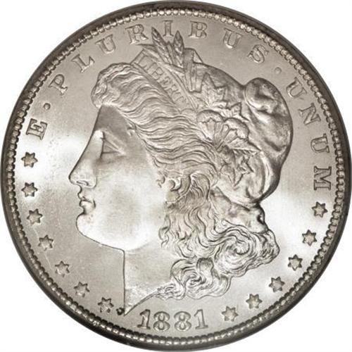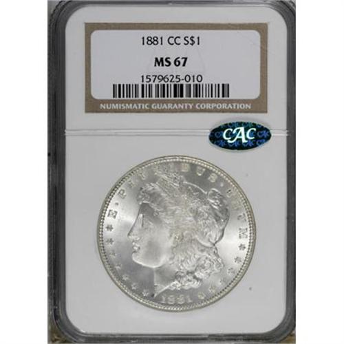<B>1881-CC $1 MS67 NGC. CAC.</B></I> VAM-2, which has die fill suggestive of repunching within the upper loops of the 8s, similar to (but much less definitive than) the 1880-CC 8 Over 7 Low VAM-6. The present exceptional Carson City example has an exacting strike and an immaculate reverse. Minor left obverse grazes preclude perfection. A popular low mintage date.<BR><BR><B>Coin Engraver:</B> George T. Morgan<BR><BR><b>Shipping:</b> Coins & Currency (<a target="_blank" href="http://www.heritageauctions.com/common/shipping.php">view shipping information</a>)