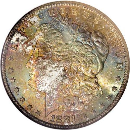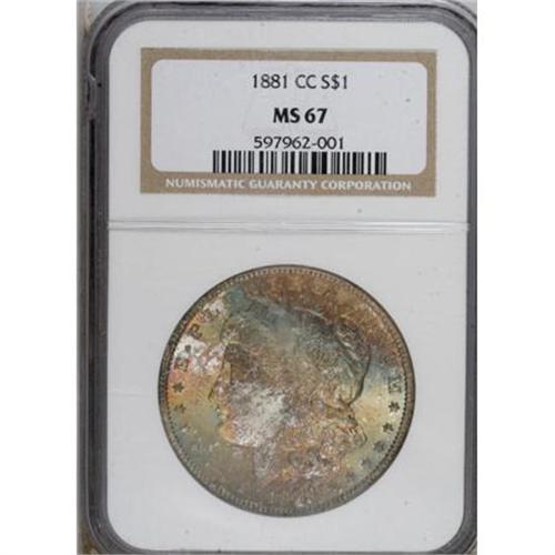<B>1881-CC $1 MS67 NGC.</B></I> Orange-red, apple-green, and sky-blue colors consume the obverse of this lustrous and pinpoint-sharp Superb Gem. The reverse has only a hint of gold toning. The portrait, the right obverse field, and the reverse are essentially immaculate, and only a single faint mark is on the left obverse field. A beautifully toned representative of this popular low mintage issue.<BR><BR><B>Coin Engraver:</B> George T. Morgan<BR><BR><b>Shipping:</b> Coins & Currency (<a target="_blank" href="http://www.heritageauctions.com/common/shipping.php">view shipping information</a>)