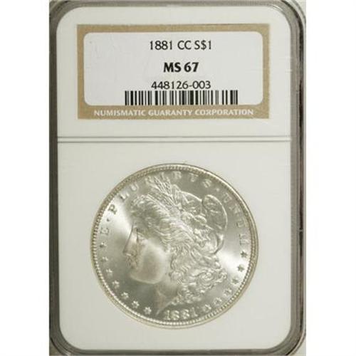 <B>1881-CC $1 MS67 NGC.</B></I> Exquisitely detailed, particularly on the richly frosted and pristine portrait. The impressively preserved silver-white fields show subtle pink, cloud-white, and gold accents. A magnificent survivor from this popular Carson City issue, likely one of the finest coins to emerge from the GSA holdings. NGC has graded just three numerically finer examples (3/08).<BR><BR><B>Coin Engraver:</B> George T. Morgan<BR><BR><b>Shipping:</b> Coins & Currency (<a target="_blank" href="http://www.heritageauctions.com/common/shipping.php">view shipping information</a>)