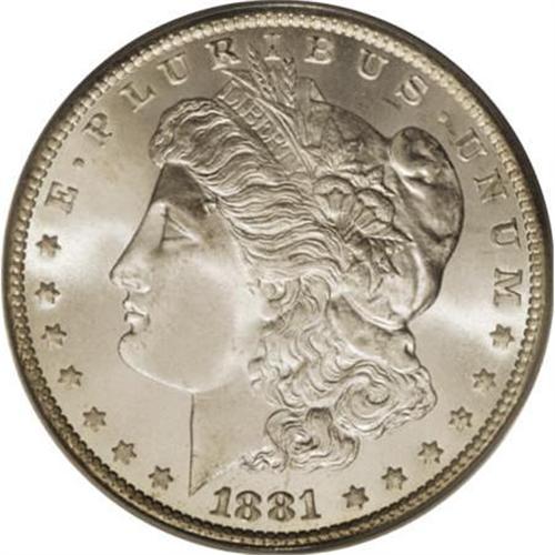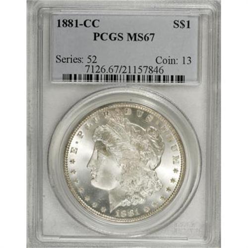<B>1881-CC $1 MS67 PCGS.</B></I> This flashy 1881-CC Superb Gem exhibits a powerful strike that emboldens the design elements, including excellent delineation in the hair at Liberty's ear and the eagle's breast feathers. A wisp or two of light olive-green patina graces the obverse, and noticeable field-motif contrast is evident on both sides. Impeccably preserved surfaces reveal no more than a few unobtrusive luster grazes. PCGS and NGC each have graded a mere three pieces finer (7/07).<BR><I>From The Arnold & Harriet Collection, Part Two.</B></I><BR><BR><B>Coin Engraver:</B> George T. Morgan<BR><BR><b>Shipping:</b> Coins & Currency (<a target="_blank" href="http://www.heritageauctions.com/common/shipping.php">view shipping information</a>)