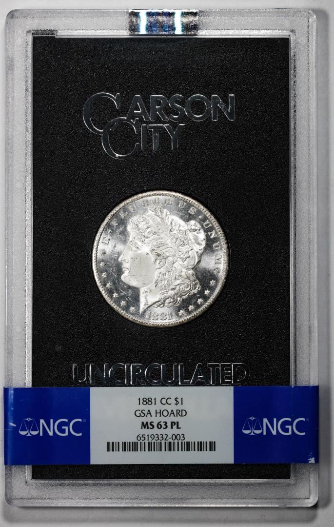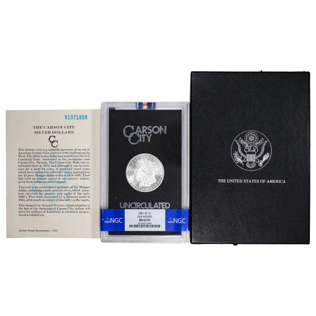One 1881-CC $1 Morgan Silver Dollar Coin GSA Hoard Uncirculated NGC MS63PL w/Box & COA. NGC Certified.