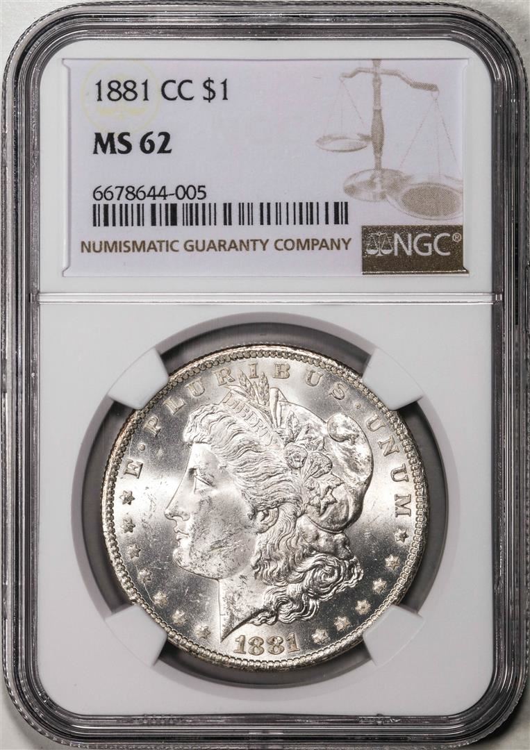 One 1881-CC $1 Morgan Silver Dollar Coin NGC MS62. NGC Certified.
