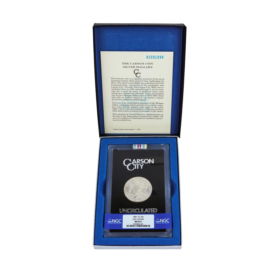 One 1881-CC $1 Morgan Silver Dollar Coin NGC MS63+ GSA w/ Box & COA. NGC Certified.