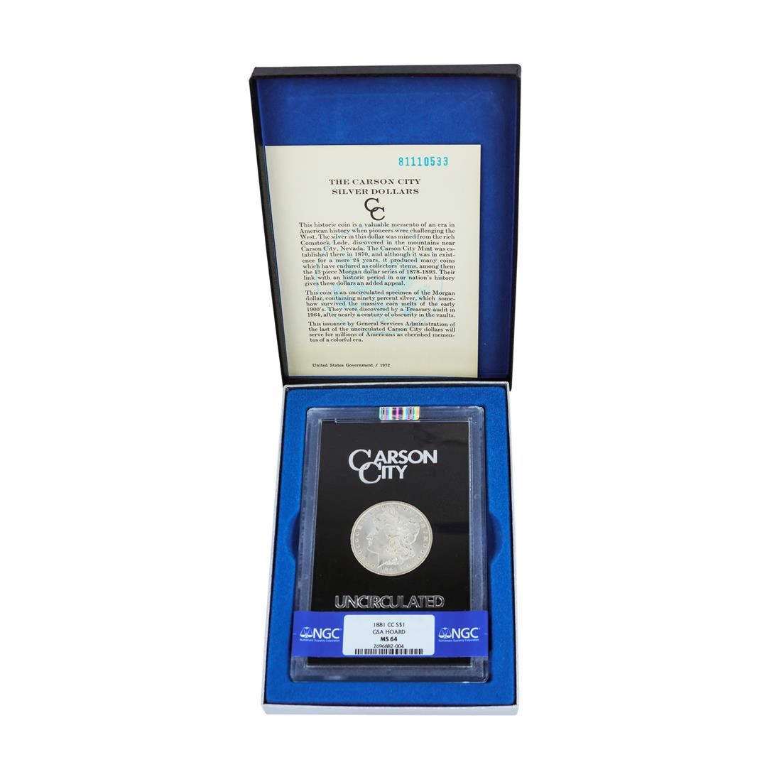 One 1881-CC $1 Morgan Silver Dollar Coin NGC MS64 GSA w/ Box & COA. NGC Certified.