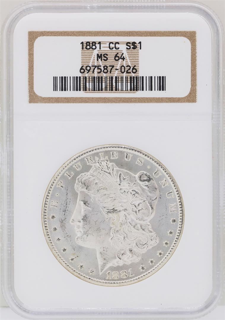 One 1881-CC $1 Morgan Silver Dollar Coin NGC MS64. NGC Certified.