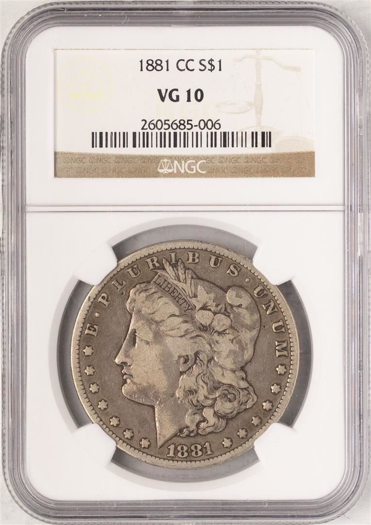 One 1881-CC $1 Morgan Silver Dollar Coin NGC VG10. NGC Certified.