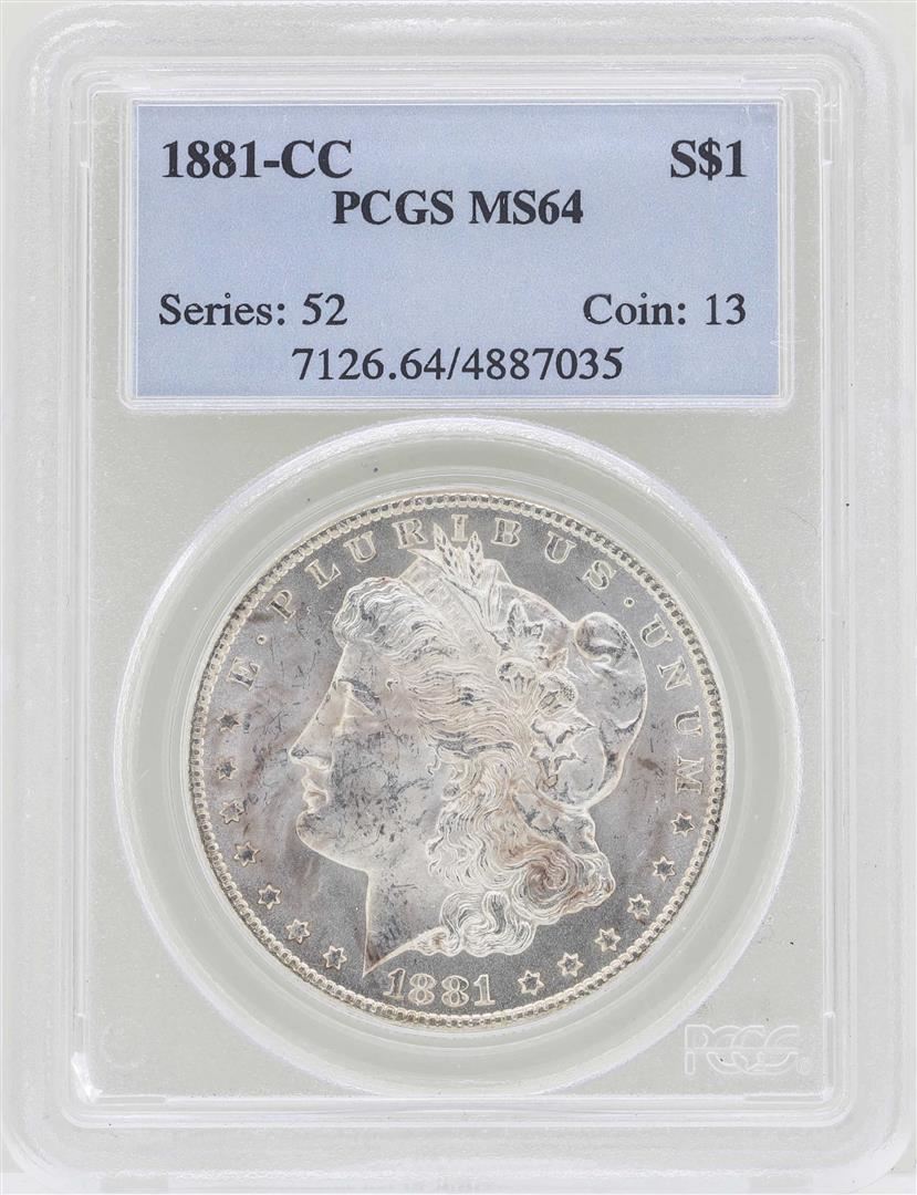 One 1881-CC $1 Morgan Silver Dollar Coin PCGS MS64. PCGS Graded.