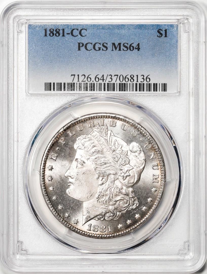One 1881-CC $1 Morgan Silver Dollar Coin PCGS MS64. PCGS Graded.