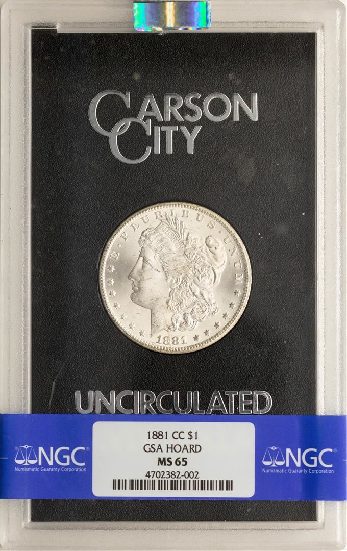 One 1881-CC $1 Morgan Silver Dollar Coin Uncirculated GSA Hoard NGC MS65. NGC Certified.