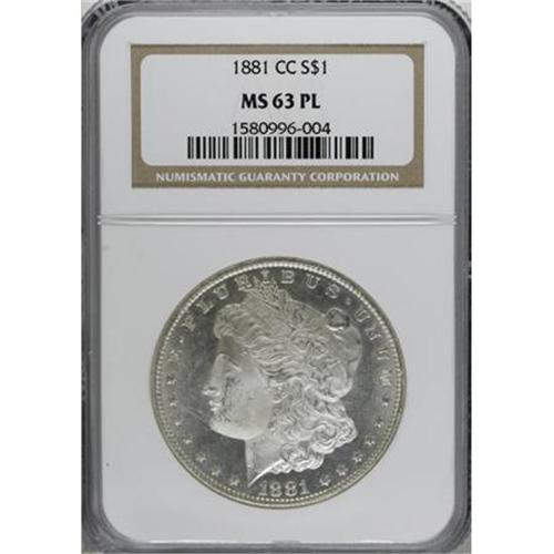 <B>1881-CC $1 MS63 Prooflike NGC.</B></I> NGC Census: (120/249). PCGS Population (290/476). Numismedia Wsl. Price for NGC/PCGS coin in MS63: $480. (#7127)<BR><BR><B>Coin Engraver:</B> George T. Morgan<BR><BR><b>Shipping:</b> Coins & Currency (<a target="_blank" href="http://www.heritageauctions.com/common/shipping.php">view shipping information</a>)