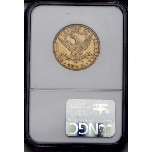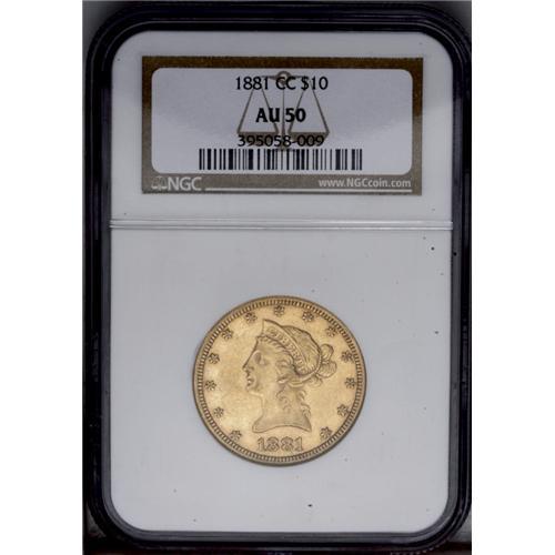 <B>1881-CC<$10> AU50 NGC.</B></I> This original orange-gold example is lustrous for the assigned grade, and a good strike only increases the eye appeal. A moderate mark in the lower obverse field identifies the piece for pedigree purposes. <BR><BR><B>Important notice:</B> Heritage usually auctions material at the rate of 200-250 lots per hour. On some occasions eBay Live bid software or the Internet may not be able to keep up with the pace of the auction. We recommend placing a realistic absentee bid now as insurance to avoid disappointment. Occasionally the auctioneer may eliminate or reject an eBay Live bid, and the auctioneer may also reopen a lot after the close of the eBay live bidding (usually because we missed an audience bid), and may reject your bid even if it shows you as the winning bidder. By bidding via eBay Live, you agree that Heritage may award the lot to another bidder at its sole discretion under the circumstances described above or any other reasonable circumstances. Since eBay bids are not shown to us until we open the lot on the floor, we treat those bids just like floor bids. In most cases the floor responds before the eBay bid is presented to us, due to Internet lag time, so for consistency we have made it a policy that floor bids are always considered first over tie eBay live bids. Also please note that all Heritage lots purchased through eBay Live carry a 20% Buyer's Premium. Please make sure you read the Terms and Conditions before you bid. This lot is being auctioned in conjunction with a live floor auction by Heritage Galleries & Auctioneers. All final auction and invoice information will be supplied by Heritage Galleries & Auctioneers, and all other information should be considered preliminary. Lot:3991 <BR><BR><B>Winning Notification and Billing:</B> After the FINAL session in this auction is complete, Heritage will send e-mail and snail mail invoices. This process normally takes several days. All final auction and invoice information will be supplied by Heritage Galleries & Auctioneers, and all other information should be considered preliminary. <BR><BR>This auction will be conducted on a live auction floor and over the Internet through eBay Live. If you choose to place an absentee bid, please take a moment to <font color='#0000ff'><u><a href='http://pages.ebay.com/liveauctions/help/before/laabsentee.html'>learn how eBay Live absentee bidding works</a></u></font><font color='#000000'>