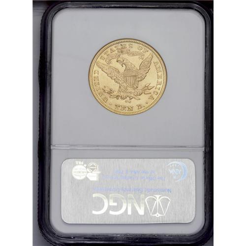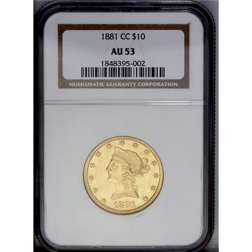 <B>1881-CC<$10> AU53 NGC.</B></I> Light highpoint wear is partly masked by a touch of softness on the hair above the ear. Highly lustrous with scattered marks on its surfaces, which are yellow-gold with a small cluster of copper spots below the eagle's beak.<BR><I>From The Clifton Rodenburg Collection.</B></I>