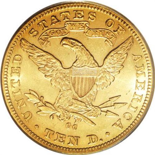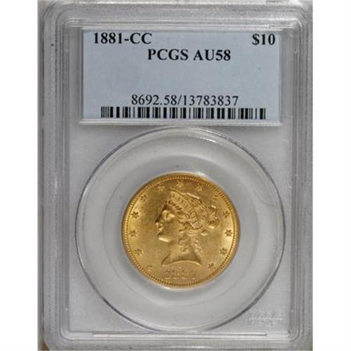 <B>1881-CC $10 AU58 PCGS.</B></I> Variety 1-A. Later die state with thin die cracks through the bottom of 881 in the date trailing off into the denticles on the right. A common CC ten and often used for type purposes, but not often found finer than near-Mint. This is an attractive piece that is missing just a bit of luster in the open areas of the fields; otherwise, the devices are surrounded by bright mint frost. Well struck, there are numerous small abrasions present on each side, but none are worthy of individual mention.<BR><BR><B>Coin Engraver:</B> Christian Gobrecht<BR><BR><b>Shipping:</b> Coins & Currency (<a target="_blank" href="http://www.heritageauctions.com/common/shipping.php">view shipping information</a>)