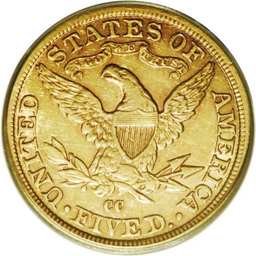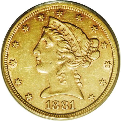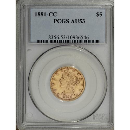 <B>1881-CC $5 AU53 PCGS.</B></I> This is a fairly well struck example although weakness is evident on the eagle's neck as usual. Both sides retain considerable luster with pleasing medium yellow-gold color and hints of rose toning around the devices. Population: 4 in 53, 11 finer (1/07).<BR><BR><b>Shipping:</b> Coins & Currency (<a target="_blank" href="http://www.heritageauctions.com/common/shipping.php">view shipping information</a>)