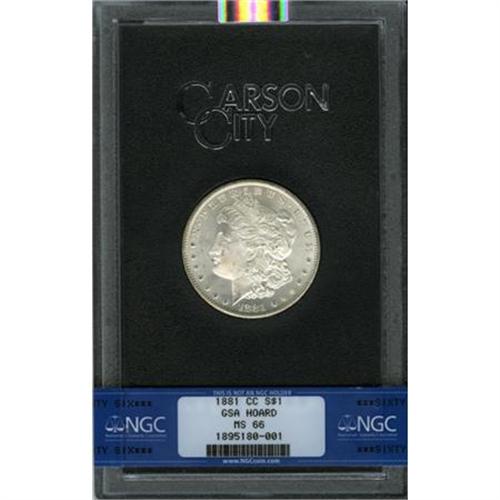 <B>1881-CC $1 MS66 NGC.</B></I> A frosty Premium Gem housed in its black plastic GSA holder and band-graded by NGC. The obverse is brilliant, while the lower left reverse exhibits lovely rainbow patina. A striking representative of this popular, low-mintage Carson City issue.<BR><BR><B>Coin Engraver:</B> George T. Morgan<BR><BR><b>Shipping:</b> Coins & Currency (<a target="_blank" href="http://www.heritageauctions.com/common/shipping.php">view shipping information</a>\)