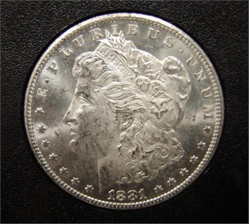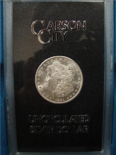 1881-CC U.S. MORGAN SILVER DOLLAR. Coin is in case marked “Carson City/Uncirculated/Silver Dollar” and box and comes with Carson City Silver Dollar information card. Information card is stamped “81103105” at top right.