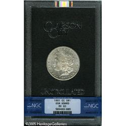 <B>1881-CC<img border='0' src='http://www.heritagecoins.com/images/star.gif' width=10 height=10>$1  MS63 NGC.</B></I> A boldly struck and nearly brilliant example that has flashy luster and a few moderate obverse blemishes.    Lot:11053