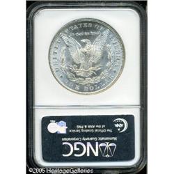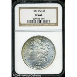 <B>1881-CC<img border='0' src='http://www.heritagecoins.com/images/star.gif' width=10 height=10>$1 MS64 NGC.</B></I> An astonishingly thick layer of mint frost covers each side of this well struck, virtually brilliant near-Gem, which has a small area of lemon-yellow color near the upper left obverse border, but otherwise displays sparkling ice-white toning throughout. Very mild scuffiness, on Liberty's face, and a couple of noticeable marks in the right reverse field, seem to barely prevent the Gem grade assessment from NGC. Lot:10024