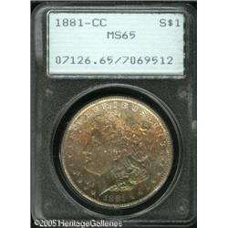 <B>1881-CC<img border='0' src='http://www.heritagecoins.com/images/star.gif' width=10 height=10>$1 MS65 PCGS.</B></I> Deep multicolored toning on the obverse, with a nearly brilliant reverse. Well struck, with no major marks. Lot:10027