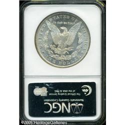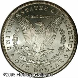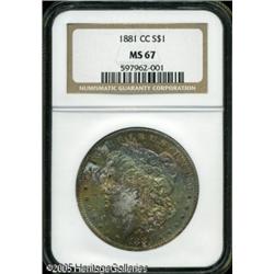 <B>1881-CC<img border='0' src='http://www.heritagecoins.com/images/star.gif' width=10 height=10>$1 MS67 NGC.</B></I> Apparently this coin's obverse rested against the side of an original canvas bag for many years. That side is covered with variegated toning in all colors of the spectrum, while the reverse is brilliant. An unusually contrasted example of this popular Carson City issue. Lot:10032