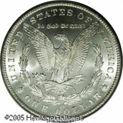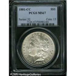 <B>1881-CC<img border='0' src='http://www.heritagecoins.com/images/star.gif' width=10 height=10>$1 MS67 PCGS.</B></I> A brilliant and completely untoned example of this popular frontier issue. The surfaces overall are heavily frosted and the striking details are completely brought up in all areas. Only the slightest abrasions and luster grazes are noted on this immaculate coin. Population: 91 in 67, 3 finer (1/05). Lot:10034