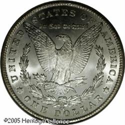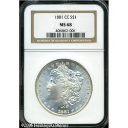 <B>1881-CC<img border='0' src='http://www.heritagecoins.com/images/star.gif' width=10 height=10>$1 MS68 NGC.</B></I> We have only offered two other MS68 examples of this date, the Jack Lee coin and the Mike Casper coin. Both were some time ago and we cannot say for certain, but our inclination is to say that neither was cleaner than this exceptional coin. Bright, even mint frost covers each side with no trace of toning. The surfaces are nearly flawless with no mentionable or noticeable abrasions on either side, just a few very shallow luster grazes that do not have any effect on the coin's overall appearance or desirability. Fully struck also with pinpoint definition over Liberty's ear as well as the breast feathers of the eagle. Population: 3 in 68, 0 finer (1/05). Lot:10035