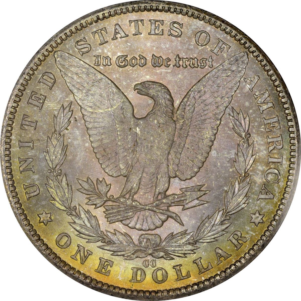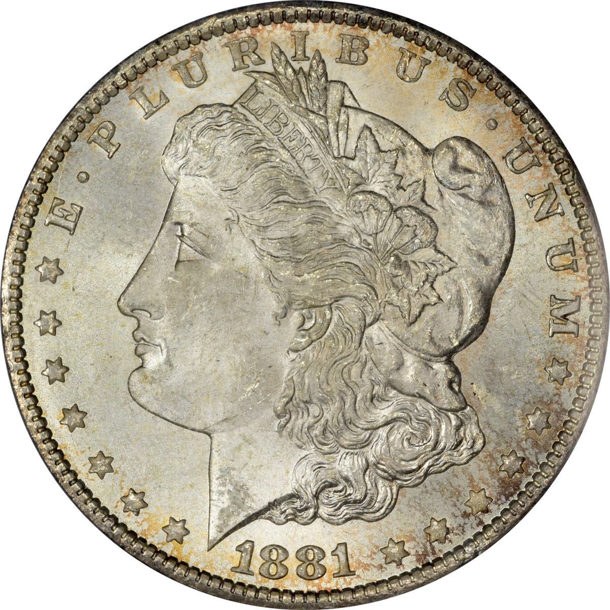 1881-CC Morgan $1. MS-65 PCGS. This frosty and brightly lustrous Carson City Morgan dollar enjoys wisps of pale golden highlights at the obverse rim, while the reverse is bathed in an even sheen of pale champagne-gold, peach, and sea-green iridescence. Sharply struck throughout. A popular semi-key issue among this mint’s Morgan dollar coinage, and always desirable at MS-65, especially when accompanied by some colorful toning highlights.