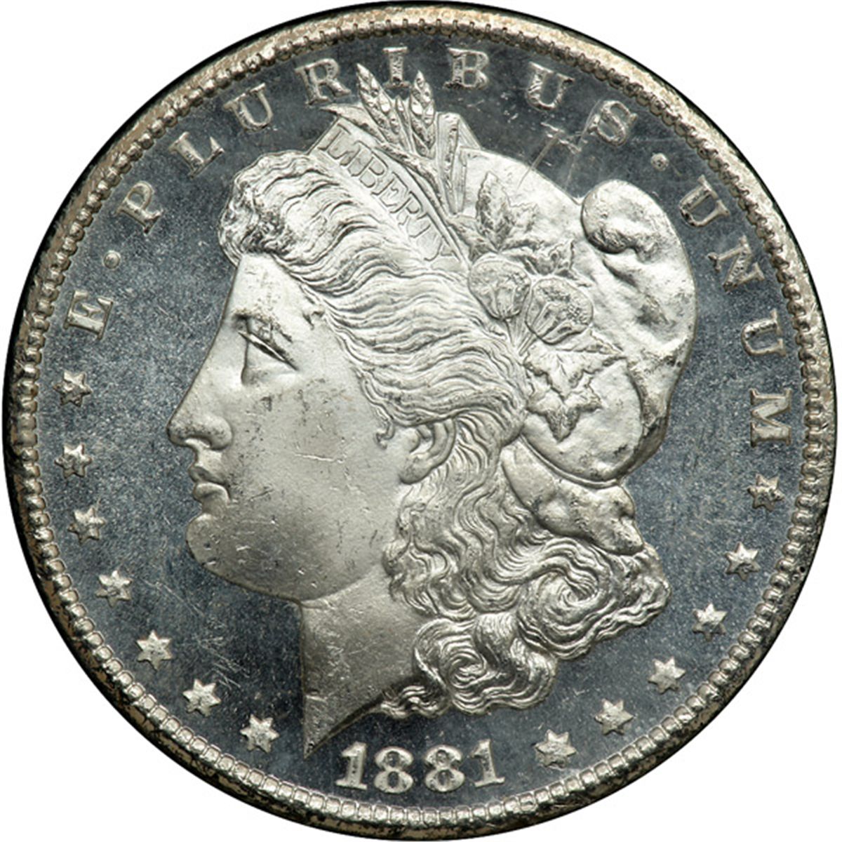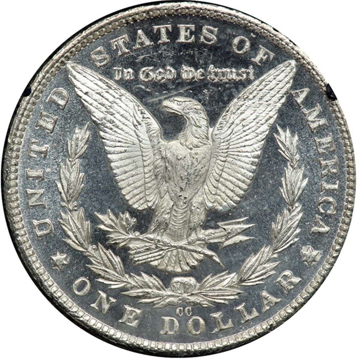 1881-CC Morgan Dollar. NGC graded MS-65 Deep Prooflike. Totally white and a gem. In the GSA black holder. Fully original on each side, the brilliant surfaces have a sheet of silvery radiance that shimmers and glow with uninterrupted beauty. Where an ineffectual imprint is sometimes left by the rebound of the dies that struck this 1881-CC’s coinage, the opposite is in fact the case here: devices show boldness and clarity plus abnormal detail in the centers. Bidders be warned, you may face stiff competition. Pop 77; 21 finer (PCGS # 8982) .