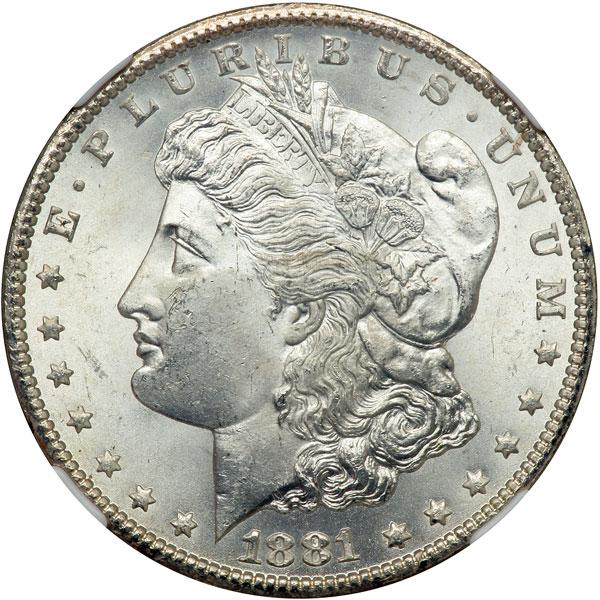 1881-CC Morgan Dollar. NGC graded MS-65. Frosty and white with all the proper care given by its former owners. Should please just about everyone (PCGS # 7126) .