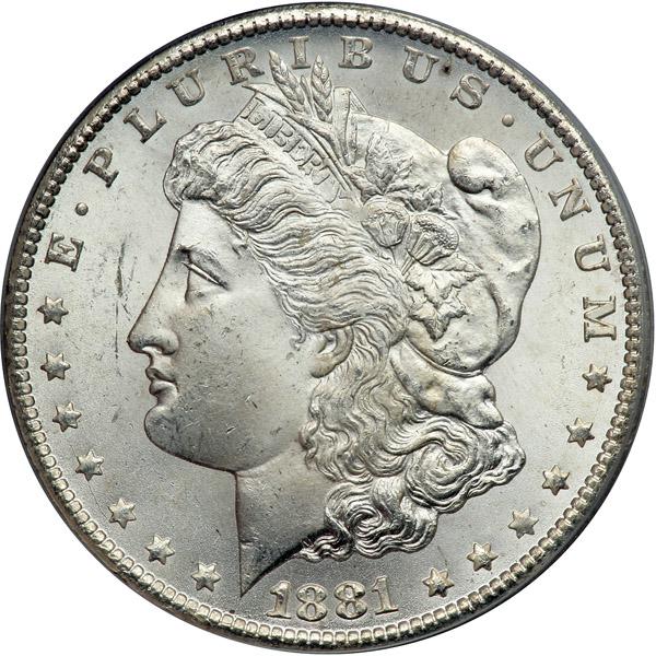 1881-CC Morgan Dollar. PCGS graded MS-65. Frosty and white, the cheek lustrous and virtually blemish free in keeping with its Gem MS65 level or preservation (PCGS # 7126) .
