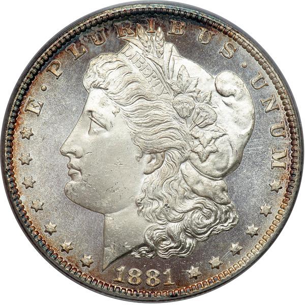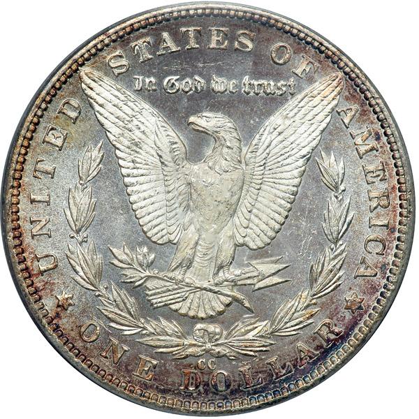 1881-CC. PCGS graded MS-65 Prooflike CAC Approved. Mostly white with a touch of multi-color toning near the borders. Pop 154; 1 in 65+ PL, 28 in 66 PL (PCGS # 7127) .