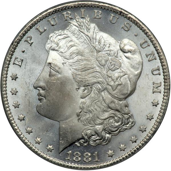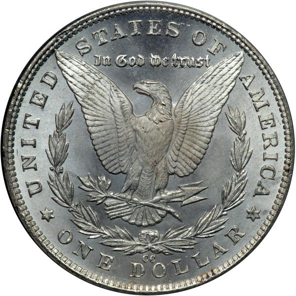 1881-CC. PCGS graded MS-65. Totally white and frosty. Exquisite detail from a firm blow by the dies that imparted deep detail, even in the centers. Full cartwheel luster. In an OGH (PCGS # 7126) .