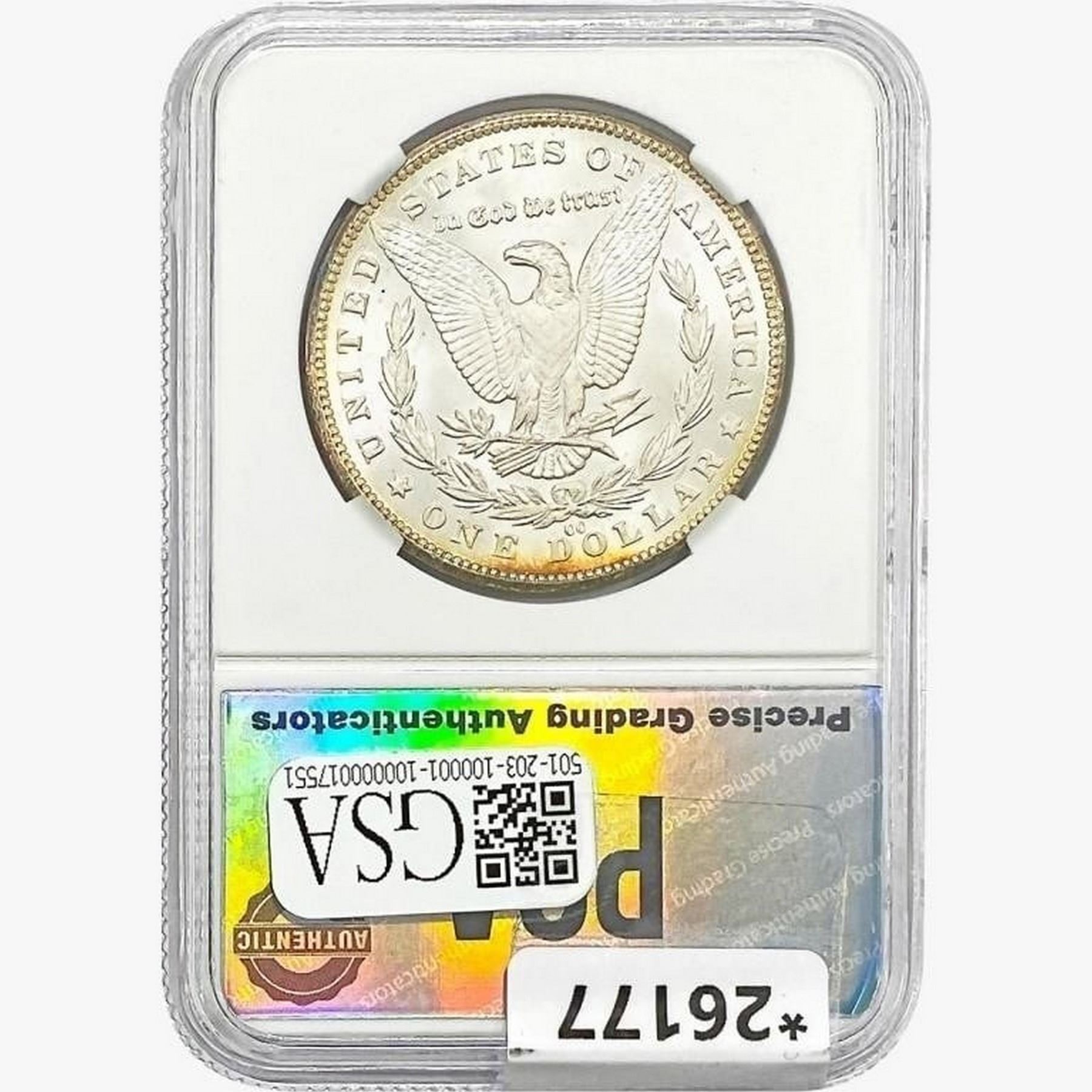 COINS AND CURRENCY LISTED IN GSA’S CATALOG AS GRADED AND ENCAPSULATED BY PCGS, NGC, ANACS, ICG, PCGS CURRENCY, PMG, PCGS BANKNOTE GRADING, CMC OR ANY OTHER THIRD-PARTY GRADING SERVICE ARE LIKEWISE SOLD “AS-IS” EXCEPT AS EXPRESSLY SET FORTH HEREIN. ALL THIRD-PARTY GRADING SERVICE GUARANTEES, INCLUDING AUTHENTICITY, ARE THE SOLE RESPONSIBILITY OF THE THIRD-PARTY GRADING SERVICE AND NOT WARRANTIES OR GUARANTEES OF GSA. BIDDERS SHOULD CONTACT THESE THIRD-PARTY GRADING SERVICES DIRECTLY WITH RESPECT TO ANY CLAIMS OR QUESTIONS THEY MAY HAVE CONCERNING THEIR GUARANTEES AND WARRANTIES. BIDDERS ACKNOWLEDGE AND AGREE THAT AUCTIONEER IS NOT BOUND BY OR LIABLE FOR ANY OPINION OR CERTIFICATION BY ANY THIRD-PARTY GRADING SERVICE. REMOVAL OF A PRODUCT FROM ITS PROTECTIVE CASING OR HOLDER OR ALTERATION OF ANY COIN HOLDER WAIVES ALL RIGHTS CONCERNING THE PRODUCT CONTAINED THEREIN.