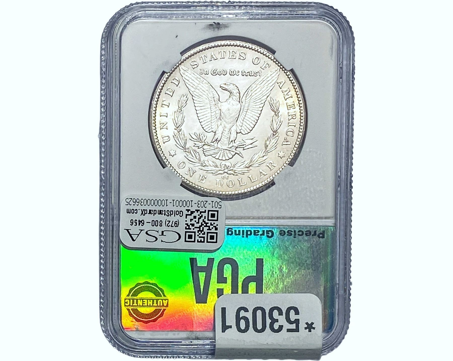 e. Coins sold referencing a third-party grading service are sold “AS IS” without any express or implied warranty, except for a guarantee by GSA that they are genuine. Removal or alteration of the holder, voids all of Bidder’s claims concerning that Product. Certain warranties may be available from the grading services and Bidders are referred to them for further details: Numismatic Guaranty Corporation (NGC), PO Box 4776, Sarasota, FL 34230, www.ngccoin.com/services/writtenguarantee.asp; Professional Coin Grading Services (PCGS), PO Box 9458, Newport Beach, CA 92658, www.pcgs.com/guarantee.html; ANACS, 6555 S. Kenton St., Ste. 303, Englewood, CO 80111; and Independent Coin Grading Co. (ICG), 7901 East Bellview, Ave., Suite 50, Englewood, CO 80111.