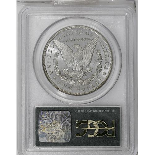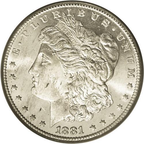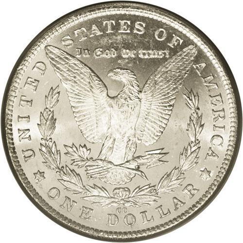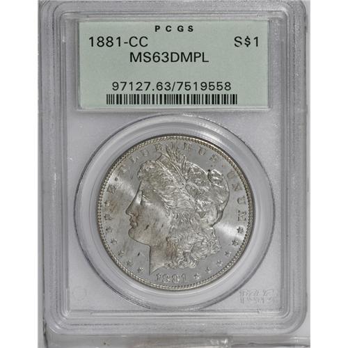 <B>1881-CC<img border='0' src='http://www.heritagecoins.com/images/star.gif' width=10 height=10>$1> MS63 Deep Mirror Prooflike PCGS.</B></I> The deeply mirrored fields contrast starkly with the frosty devices. Essentially untoned, with just a glint of pinkish hue on Liberty's neck. The reverse would probably merit a higher grade on its own, but the obverse on Liberty's lower cheek and neck also show some scuffiness. Certified in a green-label holder.