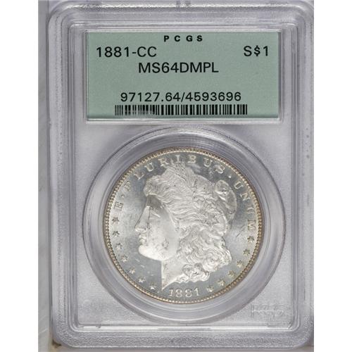 <B>1881-CC<img border='0' src='http://www.heritagecoins.com/images/star.gif' width=10 height=10>$1> MS64 Deep Mirror Prooflike PCGS.</B></I> Light gold toning visits this flashy low mintage near-Gem. Faint roller marks (as made) are occasionally evident, but the fields are well preserved. Housed in a green label holder.