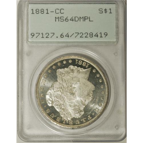 <B>1881-CC S$1 MS64 Deep Mirror Prooflike PCGS.</B></I> Thick mint frost resides on the devices and the mirrors show exceptional depth. Nearly brilliant aside from a few tiny toning flecks that are located mostly on the reverse. Housed in a first-generation PCGS holder.<BR><BR><b>Shipping:</b> Coins & Currency (<a target="_blank" href="http://www.heritageauctions.com/common/shipping.php">view shipping information</a>)